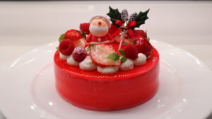 蒸留酒漬けグリオット(サワーチェリー)入り。ピスタチオのババロアとグリオットのムース。ピスタチオのムースリーヌにフィアンティーヌ、ピスタチオのリースをかぶせてクリスマス気分